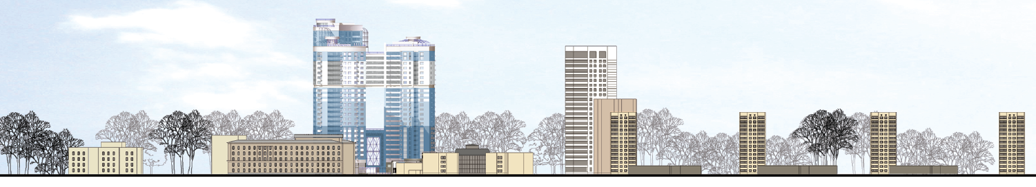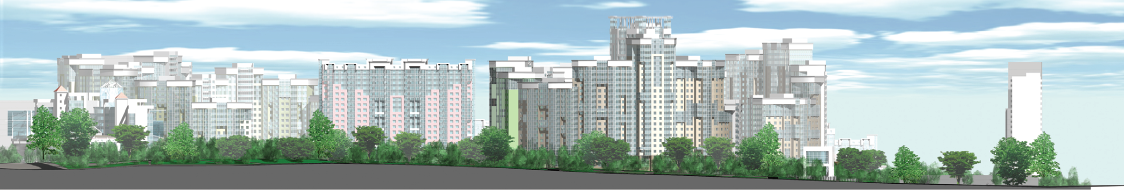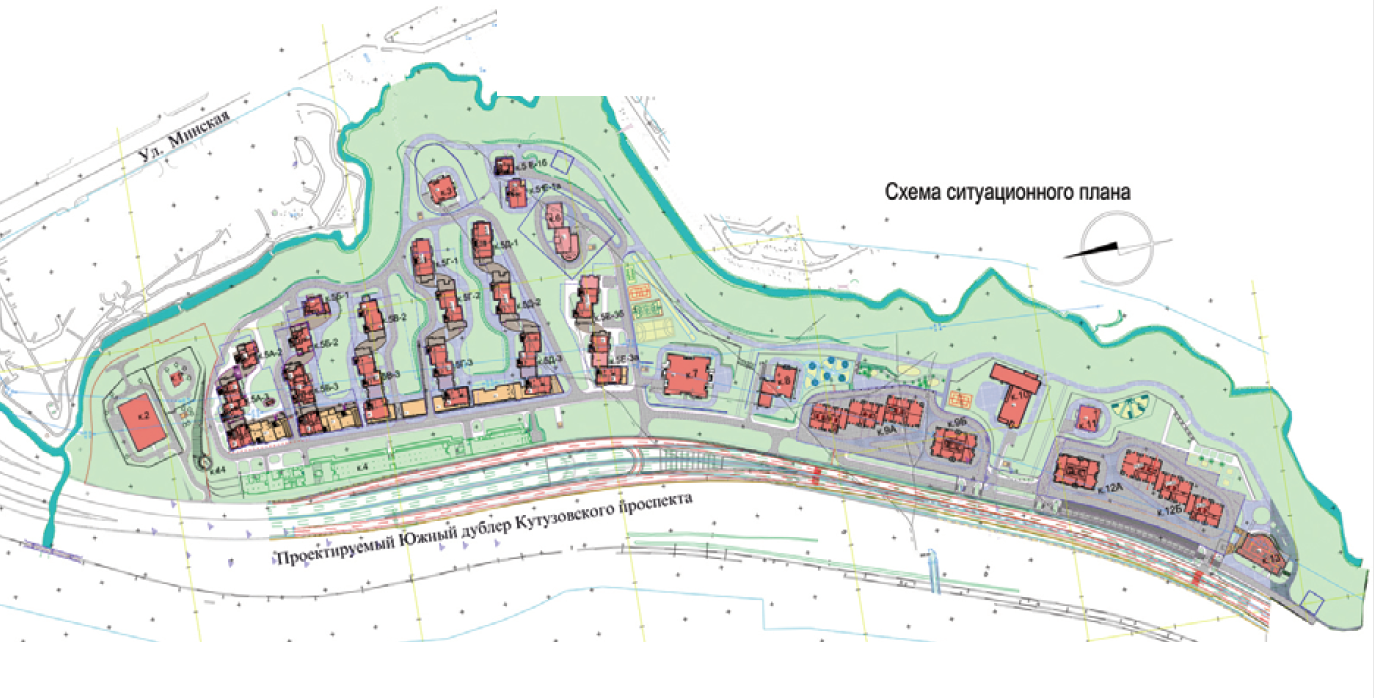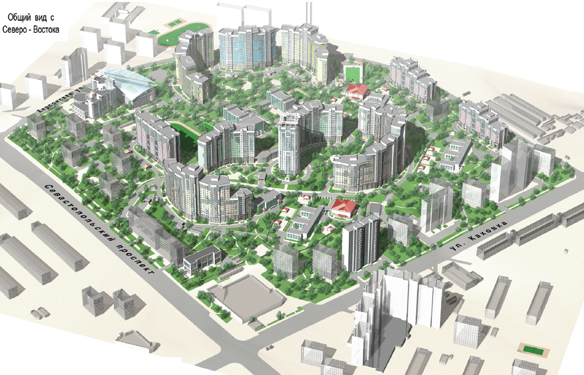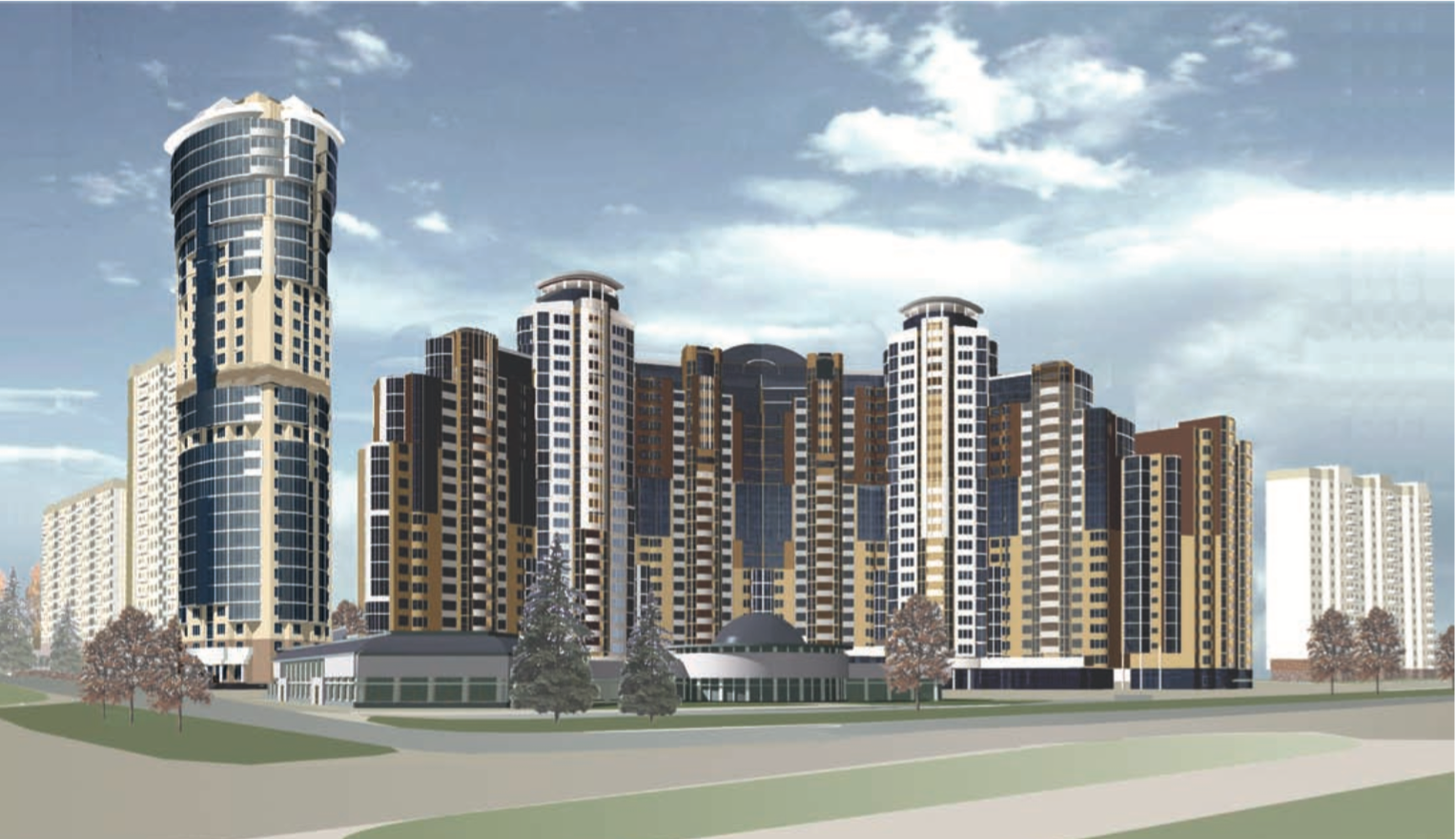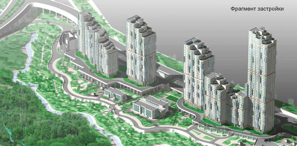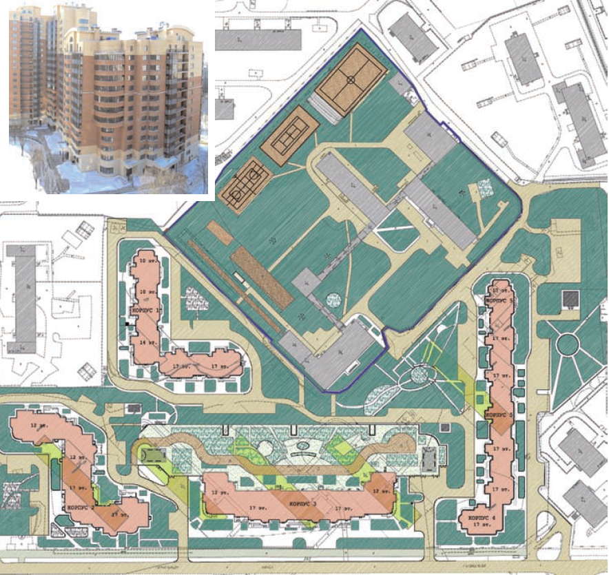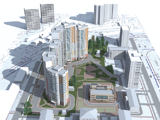 - В соответствии с планировкой участок разделен на три части. В северной части запроектирован жилой комплекс с зданиями средней этажности, гаражом, дошкольным образовательным учреждением (корп. 3), общеобразовательной школой (корп.7), КНС (корп.1) и очистными сооружения (корп. 2). В южной части запроектированы два высотных градостроительных комплекса, два детских дошкольных образовательных учреждения (корп. 8 и 11), общеобразовательная школа (корп.10) и поликлиника на 500 посещений в смену. Высотный комплекс 1 (корп.9) состоит из башни со стилобатом и трехсекционного объема с первыми нежилыми этажами. Эти этажи вместе со стилобатом объединяют два жилых здания в единый комплекс. В подземном пространстве - гараж - автостоянка, ГО. Второй, трехсекционный, -19-25, 13-18, 55-57. Высотный Комплекс 2 (корп.12) состоит из башни со стилобатом и трехсекционного объема с первыми нежилыми этажами. Эти этажи вместе со стилобатом объединяют два жилых здания в единый комплекс. В стилобатной и подземной частях комплекса расположены помещения для обслуживания жителей комплекса и автостоянки.