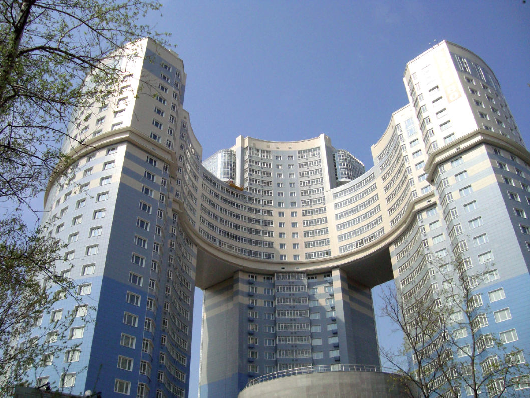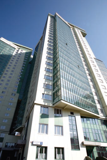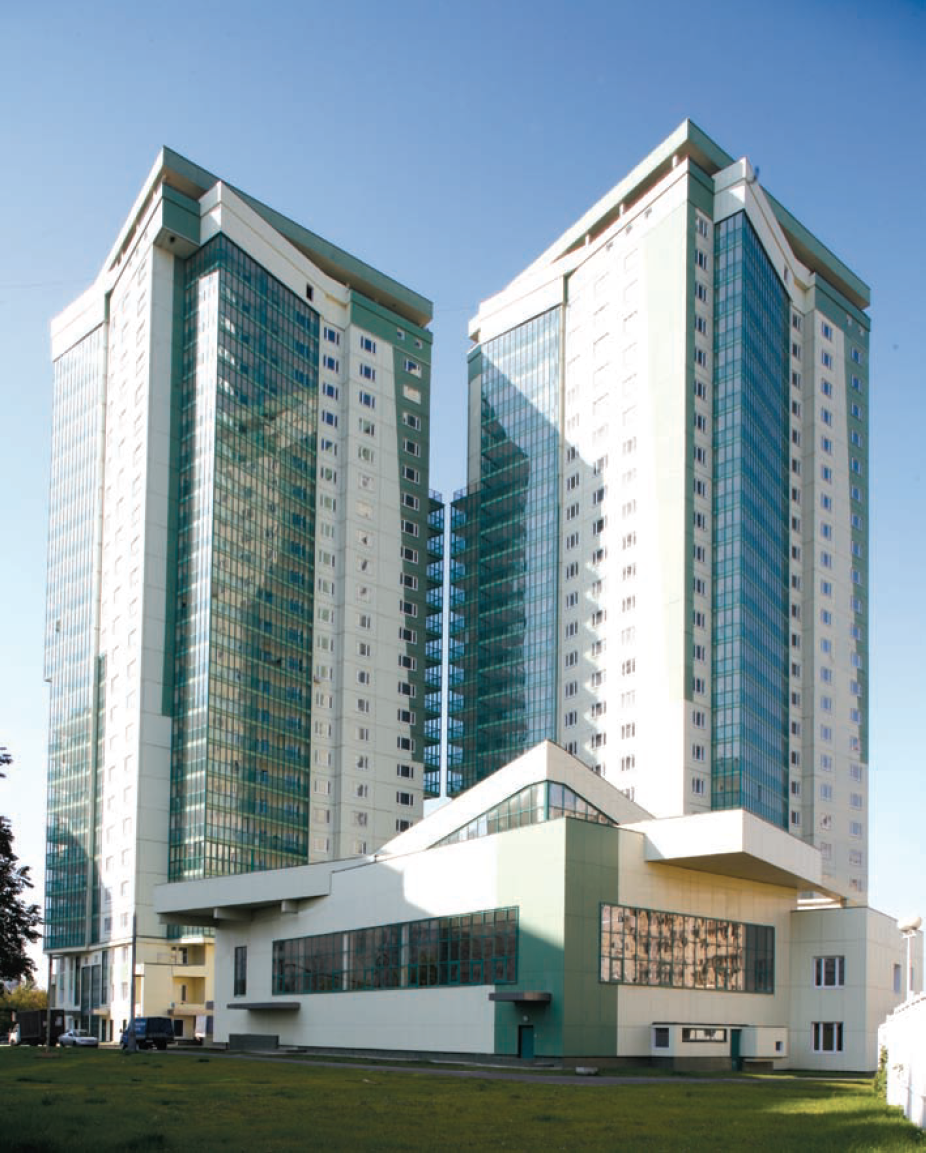 - Жилой комплекс по индивидуальному проекту состоит из четырех 17 этажных корпусов, образующих в плане круг. Первые этажи запроектированы нежилые с помещениями различного назначения, на втором этаже и выше расположены: 1, 2, 3, 4-комнатные квартиры повышенной комфортности. Под всеми корпусами предусмотрено размещение единого подземного гаража. Пространство двора решено с применением мощения цветной пескобетонной плиткой, декоративных стенок, малых архитектурных форм – территорию украшают цветники с подсветкой декоративными торшерами.