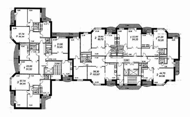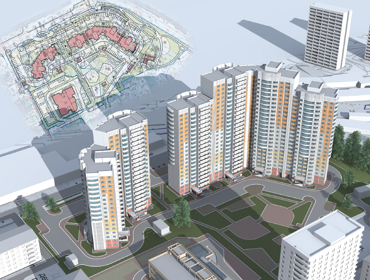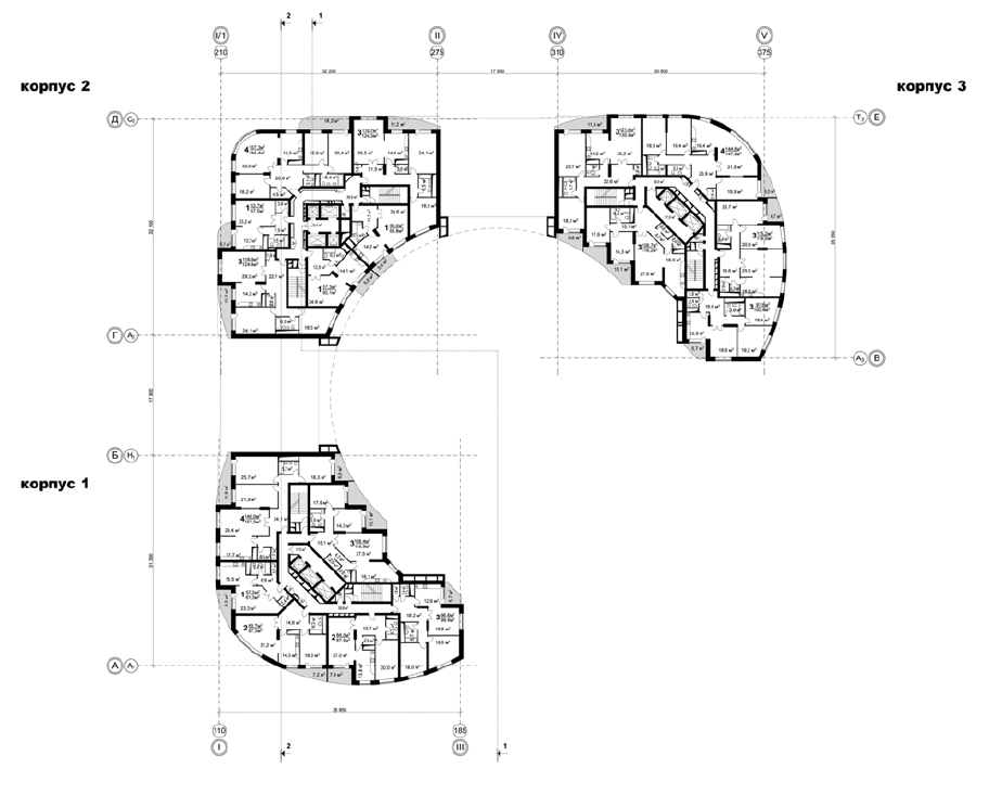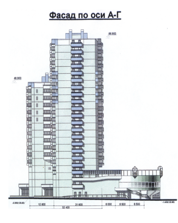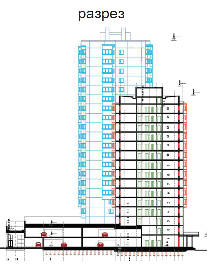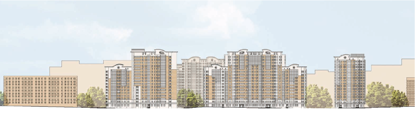 - На участке предполагается разместить построенный по индивидуальному проекту 6-секционный 20-22-этажный жилой дом с нежилыми помещениями в первых этажах и подземной двухуровневой автостоянкой на 264 м/м, 2 секционный 18 этажный жилой дом серии КОПЭ с фасадами «Парус», с пристроенной подземной двухуровневой автостоянкой на 78м/м и индивидуальный 32 этажный жилой дом с первым нежилым этажом. В жилых домах предусмотрено 770 квартир общей площадью квартир 52875,5 м2. Высота жилого этажа от пола до пола – 3метра. Высота первого нежилого этажа составляет 4,2 м.