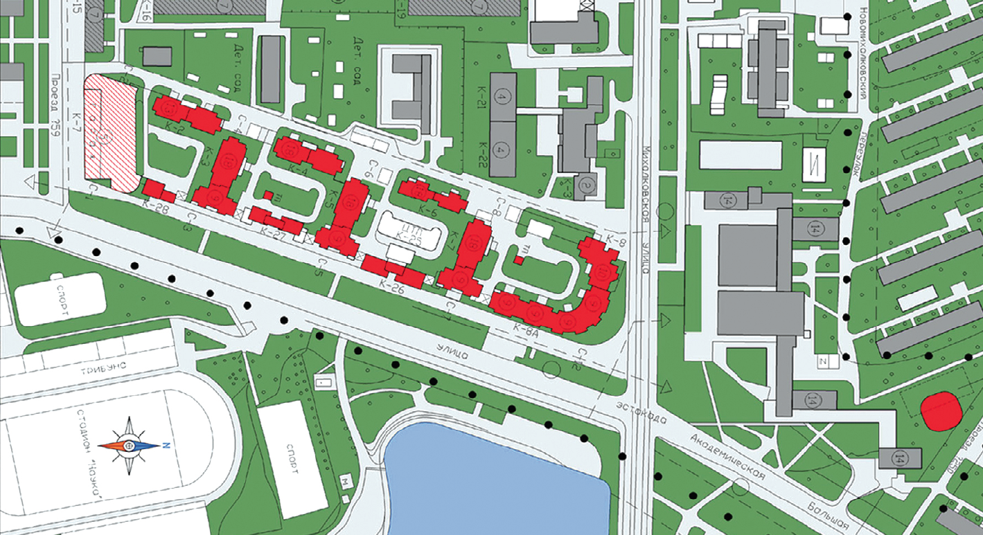 - Застройка по ул. Академической это группа жилых образований, формирующих квартальное пространство на месте снесенных пятиэтажных домов и отдельностоящий 23-этажный односекционный жилой дом, расположенный внутри квартала. Пластичная моделировка объема этой башни по вертикали обусловлена выполнением норм инсоляции комнат и естественной освещенности. Вдоль Б. Академической улицы расположены жилые дома, возведенные по индивидуальным проектам с переменной этажностью. Квартиры высотных частей зданий выходят на Тимирязевский пруд и спортивный комплекс благодаря пониженной 9-этажной части жилых домов. Стены домов выполнены из ячеистого бетона и составляют с дисками перекрытий прочную устойчивую систему. Снаружи стены выложены лицевым кирпичом. Традиционное для Москвы сочетание красного и белого цветов подчеркивает пластику фасадов. Выделение нижних этажей белым цветом зрительно облегчает массивный объем зданий.